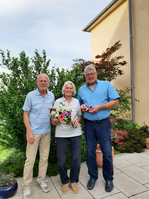 TV-Vorsitzender Herbert Hugger (rechts) bedankte sich im Namen des TV Passau für 80 Jahre Treue zum Verein und überreichte ihr nachträglich die Ehrennadel sowie einen Blumenstrauß, da die Jubilarin aus gesundheitlichen Gründen an der Jahreshauptversammlung im April nicht teilnehmen konnte. Sportwart Erich Kopp (links) lieferte zur kleinen privaten Feier eine schriftliche Laudation. Die TV-Abordnung wünschte Frau Schauer in Vorfreude auf das Jubiläum für 85 Jahre Mitgliedschaft alles Gute und vor allem viel Gesundheit.
