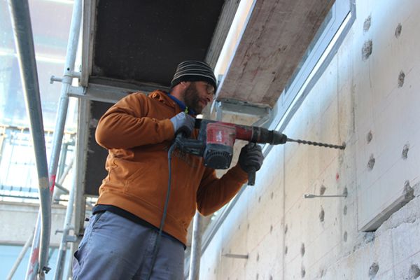 Um diesen zu installieren, musste zuerst das alte Gelände mit einem Graben umrundet werden, in dem entsprechenden Erdkabeln verlegt wurden. Für die Anschlussarbeiten vom Dach zur Erde war dann das Gerüst, aus baulichen Sicherheitsgründen, unerlässlich.