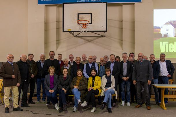 Die anwesenden Geehrten und die Ehrengäste eingerahmt vom alten und neuen TV-Vorsitzenden Herbert Hugger (re.) und dem Ehrung - Laudator Stadtrat Siegfried Kapfer.